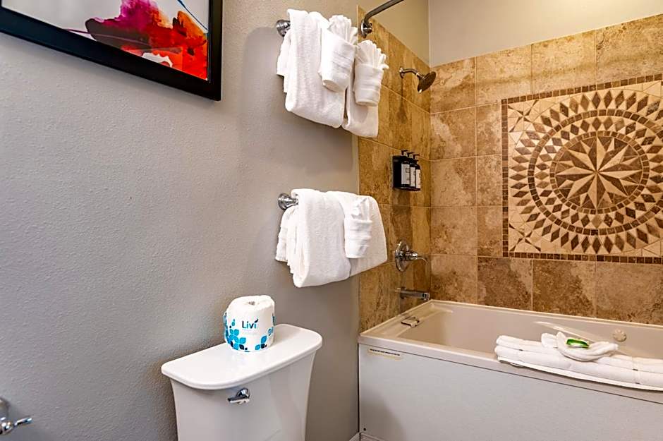 This spacious suite includes a fireplace, flat-screen TV and a sofa bed. A microwave, small refrigerator, coffeemaker and toaster are also provided, as is a 2-person jetted tub. Bathrobes are available.